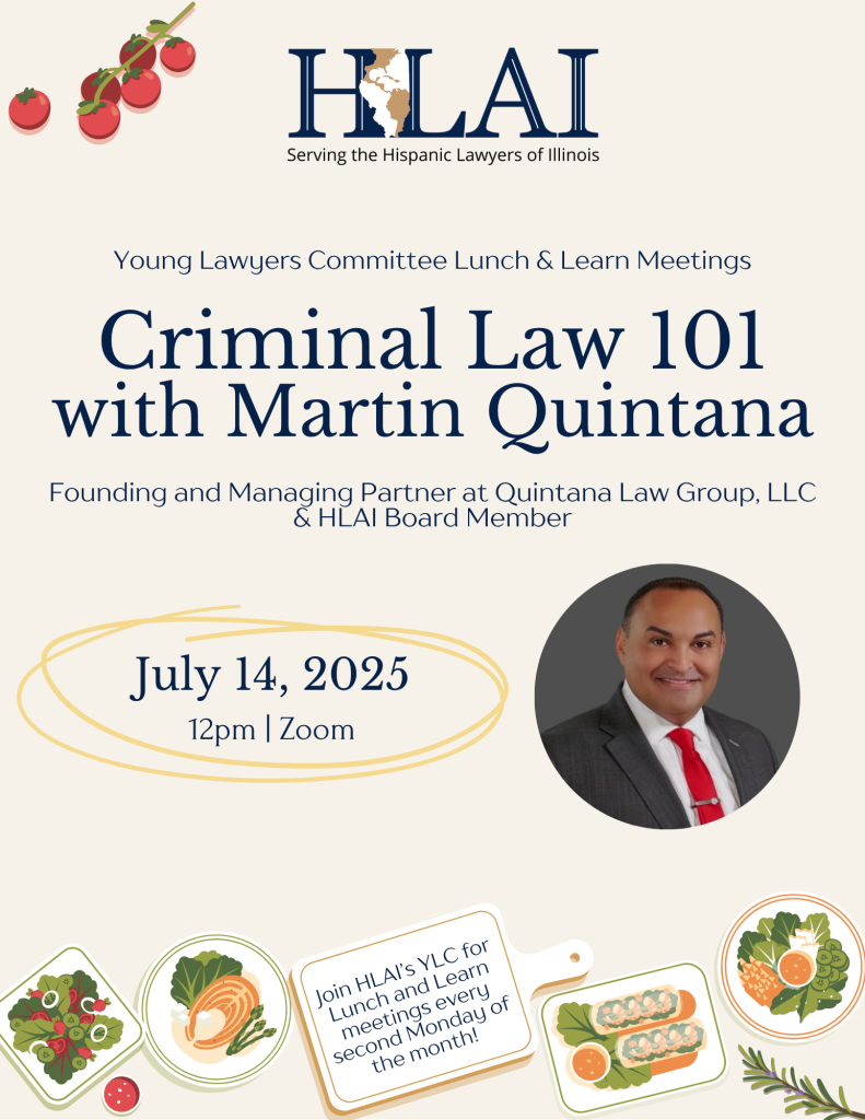 Join us to learn the basics of criminal law from HLAI’s past president Martin Quintana. July 14 at 12p via Zoom Email ylc@hlai.org to RSVP