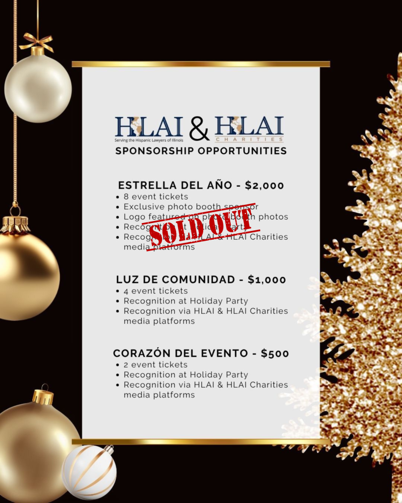 This holiday season, partner with us to support the Hispanic legal community! The HLAI and HLAI Charities Holiday Party is coming up, and weโre inviting firms and organizations to join us as event sponsors. Your support will help us continue our work providing scholarships for aspiring Hispanic lawyers.